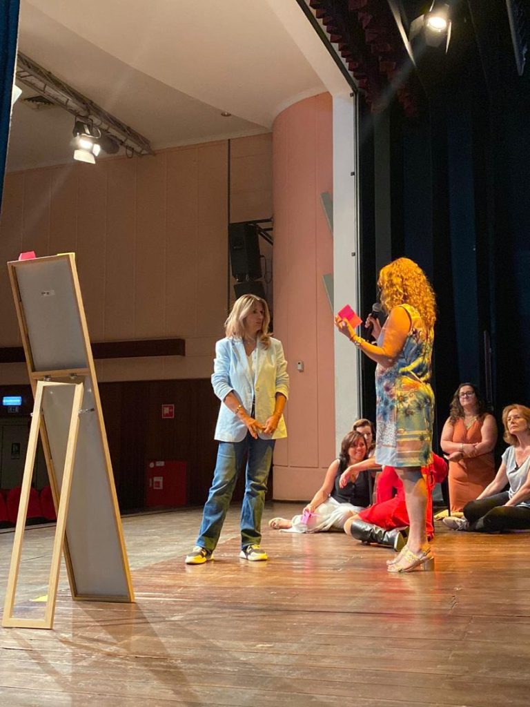Subi ao palco com um exercício diferente: convidar pessoas a perceber o que os outros veem nelas (pessoas que não as conheciam) e confrontar isso com a sua própria perceção.